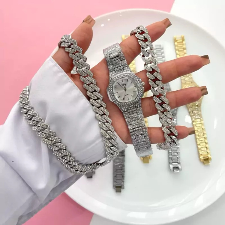 ست خوشگل فول نگین ساعت و دستبند و گردنبند فول نگین استیل رنگ ثابت_نگین اتمی ثابت...ساعت موتور ژاپن..کیفیت عالی حراج فوق العاده فری سایز مخصوص دخترای خوش سلیقه