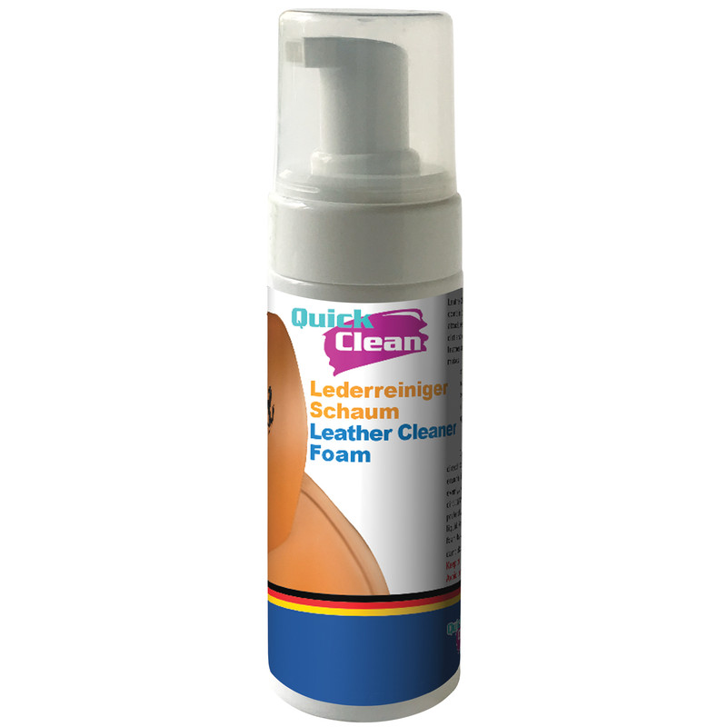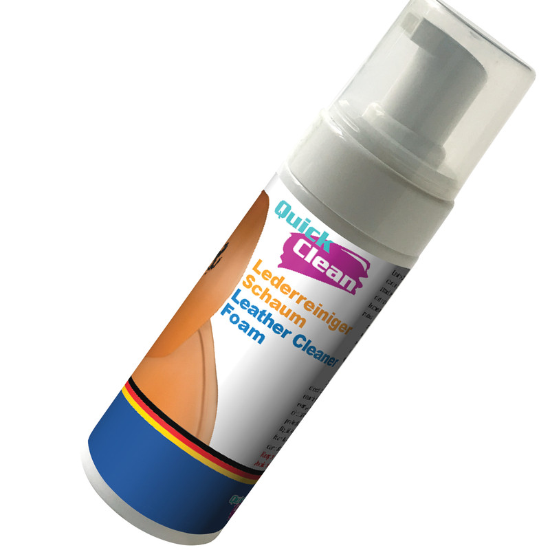 فوم تمیزکننده و تقویت کننده چرم کوییک کلین Leather Cleaner Foam در حجم 150 میلی لیتر می باشد. این فوم تمیزکننده مناسب انواع سطوح چرم مصنوعی داخل داخل خودرو می باشد. در پروسه ی دیتیلینگ خودرو یکی از مهمترین موارد توجه به تمیزی سطوح صندلی خودرو می باشد. فوم جرمگیر چرم را روی سطح صندلی اسپری کرده و توسط دستکش نرم یا فرچه ی دیتیلینگ مناسب سطح مورد نظر را شستشوی داده و سپس توسط دستمال مایکروفایبر سطح را کاملا تمیز نمایید.