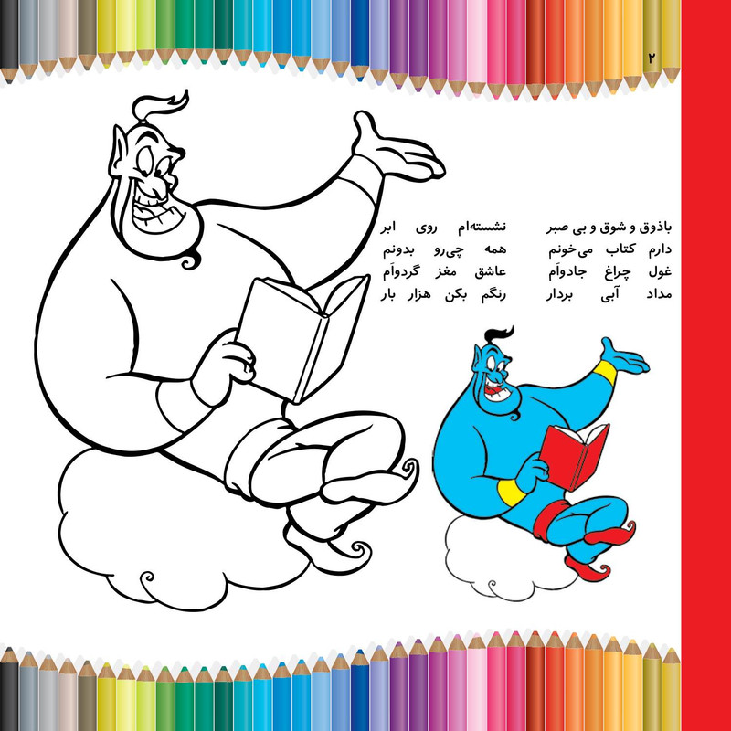 با ذوق و شوق و بی صبر، نشسته ام روی ابر دارم کتاب میخونم، همه چی رو بدونم غول چراغ جادواَم، عاشق مغز گردواَم مداد آبی بردار، رنگم بکن هزار بار برای رنگ آمیزی تصاویر و خواندن ادامه این شعر قشنگ کتاب رنگ رنگ، رنگم کن ۶ را می توانی بخری.