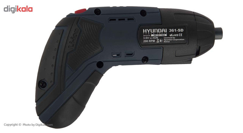 دستگاه فوق یکی از محصولات تولیدی شرکت «هیوندای» (Hyundai) است که تحت عنوان مدل «SD-361» به بازار عرضه میشود. این پیچ گوشتی شارژی سایز کوچکی دارد و از وزن کمی برخوردار است. ابعاد این دستگاه 155 × 100 × 43 میلیمتر بوده و وزن آن حدود 340 گرم است. این پیچ گوشتی شارژی انرژی مورد نیاز خود را از یک باتری لیتیوم یونی با ولتاژ 3.6 ولت و ظرفیت 1.5 آمپرساعت تامین میکند. این باتری برای شارژ کامل به زمانی حدود 3 تا 5 ساعت نیاز دارد. این پیچ گوشتی طراحی بسیار سادهای دارد و سرعت و گشتاور آن ثابت بوده و قابل تغییر نیست. سرعت چرخش این دستگاه حدود 200 دور بر دقیقه است و میزان گشتاور آن 3 نیوتن متر اندازهگیری شده است. شرکت هیوندای برای راحتی بیشتر کاربر در حین کار با این محصول مجموعهای 102 عددی شامل انواع درایو و سری پیچ گوشتی عرضه میکند. این مجموعه درون کیفی مخصوص قرار دارد.