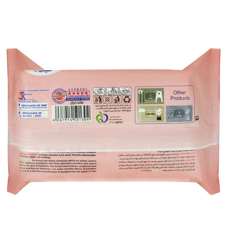 دستمال مرطوب کودک وی کر مدل عصاره جوانه گندم و روغن بادام 72 برگی مجموعه 2 عددی با دارابودن یک لایه ی نازک روغنی از روغن های معجزه آسای طبیعی ، از پوست لطیف کودک مراقبت می نماید همچنین این دستمال مرطوب کودک وی کر عاری از الکل ، پارابن و مواد شیمیایی مضر است و دارای خصوصیات ویژه زیر میباشد: دستمال مرطوب کودک پاکتی درب دار وی کر حاوی عصاره جوانه گندم و روغن بادام دارای Ph5.5 بوده که مناسب پوست حساس کودک می باشد. دستمال مرطوب Wee Care ضد التهاب، ضد خارش و ترمیم کننده می باشد و به دلیل دارا بودن روغن بادام سرشار از زینک، منیزیم، ویتامین های B و E بوده و موجب آبرسانی و مرطوب کنندگی پوست میشود؛ همچنین از سوختگی های ناشی از عرق و ادرار جلوگیری می کند. لازم به ذکر است که این دستمال مرطوب بچه وی کر با منسوج نبافته 100% پنبه ای تولید شده است که برای پوست لطیف و حساس کودک مناسب می باشد. موارد موثر درتولید دستمال مرطوب وی کر به شرح زیر میباشد : روغن بادام نرم کننده و ترمیم کننده پوست بوده و از آن در مقابل خشکی محافظت می کند ؛ همچنین روغن بادام با داشتن زینک ، منیزیم ، آهن و ویتامین های E, B2, B6 باعث آرامش پوست می شود. غلظت ویتامین E موجود در روغن بادام همچنین میتواند به درمان آسیبهای ناشی از نور خورشید و محو شدن جای زخم ها کمک کند. خواص مرطوب کنندگی روغن بادام میتواند به تسکین خارش پوست کمک کند. عصاره جوانه گندم : این عصاره یکی از غنی ترین منابع ویتامین A, D, E, K می باشد و مانع التهاب ، خشکی و ترک پوست بوده و خاصیت نرم و مرطوب کنندگی دارد و همچنین به ترمیم سلول های آسیب دیده کمک می کند. جوانه گندم سرشار از ویتامین های E و C است؛ به همین دلیل محافظ پوست در برابر آفتاب می باشد و از ایجاد لکه های ناشی از آفتاب جلوگیری می کند. مصرف کننده گرامی ، تمامی محصولات برند وی کر فاقد پارابن میباشد.