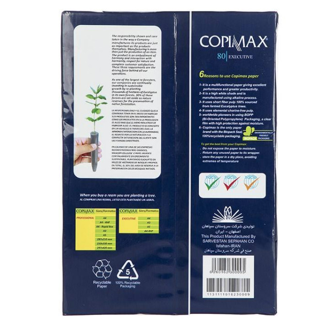 امروزه کاغذ A4 در هر ارگان وسازمان و اداره ای از ضروری ترین لوازم به شمار می رود. کاغذ A4 کپی مکس جزو با کیفیت ترین کاغذها در بازار است که نه تنها نوشته های شما را تمیز و واضح نشان می دهد بلکه برای کپی و پرینت و فکس نیز مناسب بوده و دانش آموزان می توانند از آن استفاده های زیادی بکنند. طول این کاغذ 29.7 سانتی متر و عرض آن 21 سانتی متر بوده که ابعاد مورد نظر برای کاغذ A4 است و وزن یک متر مربع از آن 80 گرم است. خرید کاغذ A4 با این کیفیت و ویژگی ها و با توجه به به صرفه بودن قیمت کاغذ A4 کاملا مناسب بوده و مقرون به صرفه خواهد بود. کپی مکس، یکی از معروفترین برندهای کاغذ در ایران است. محصولات این برند با فرایند آلکالاین و با بهرهگیری از فیبر درخت اکالیپتوس ساخته میشوند. یکی از مهمترین مواردی که به خرابی و افت کیفیت دستگاههای چاپ منجر میشود، مرغوب نبودن کاغذ مورداستفاده است. برگههای نامرغوب و یا بریده شده با روشهای غیراستاندارد دارای پرزهای ریزی در سطح و لبه خود هستند. این پرزها در حین فرایند چاپ وارد بخشهای مختلف دستگاه شده و رفتهرفته منجر به خرابشدن دستگاه و از دست رفتن کیفیت اولیه چاپ آن میشوند. کاغذ A4 کپی مکس با کیفیتی مثالزدنی، از پرینتر شما محافظ کرده و با قیمت مناسب، بهترین گزینه برای خرید برگه A4 است.