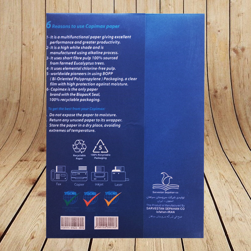 سایر توضیحات : کاغذ A5 گرماژ 80 از برند کپی مکس درجه یک کاملا سفید و تولید شده به کمک فرآیند آلکالاین که از ذرات فیبر استخراج شده از درختان اکالیپتوس ساخته شده است.