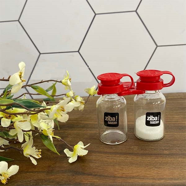 نمکپاش 2 عددی زیبا، که بدنه آن از جنس شیشه و درب آن از جنس پلاستیک میباشد، با توجه به قطعه پلاستیکی که دارد دو ادویه پاش را در کنار هم نگه میدارد.