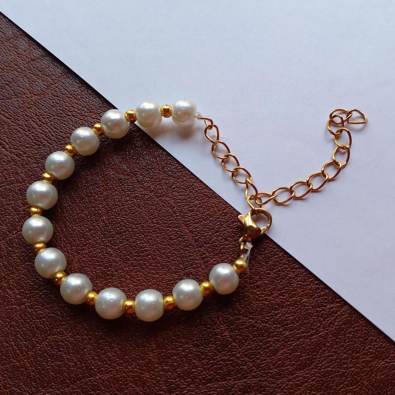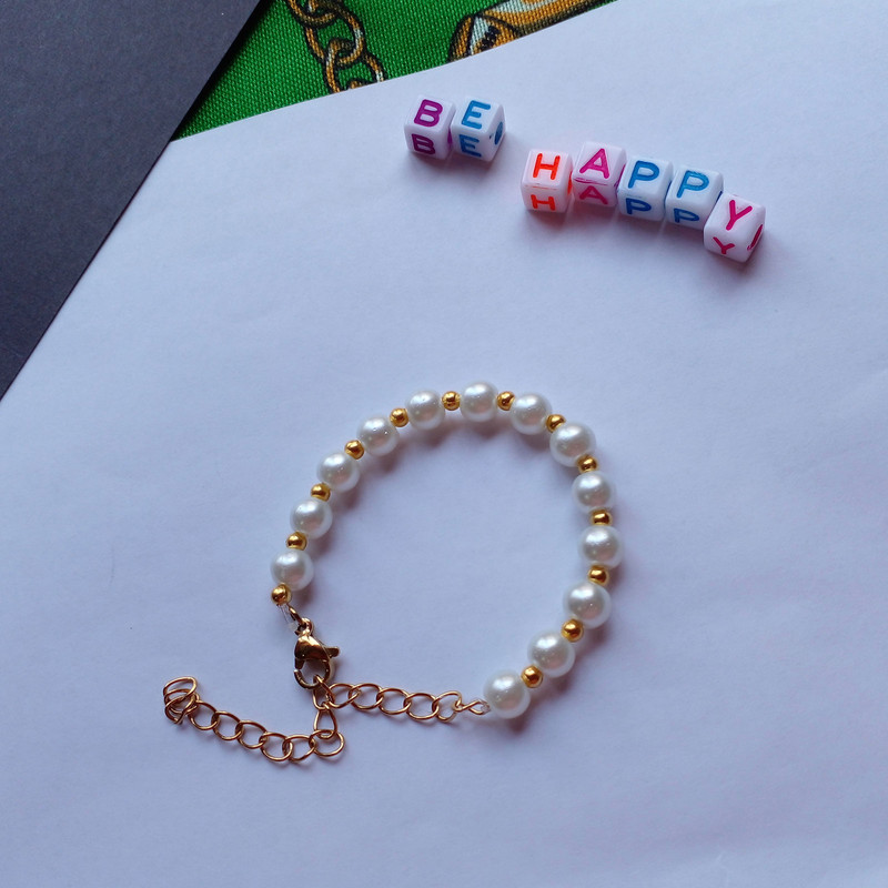 دستبند بچه گانه با مرواریدهای سفید زیبا که در بین آن مهره های ریز طلایی کار شده و زیبایی دو چندانی به دستبند بخشیده است. دستبند با قفل قابل تنظیم زنجیری باز و بسته می شود و برای سایزهای مختلف دست مناسب می باشد. این دستبند بهترین اکسسوری برای کودکان است.