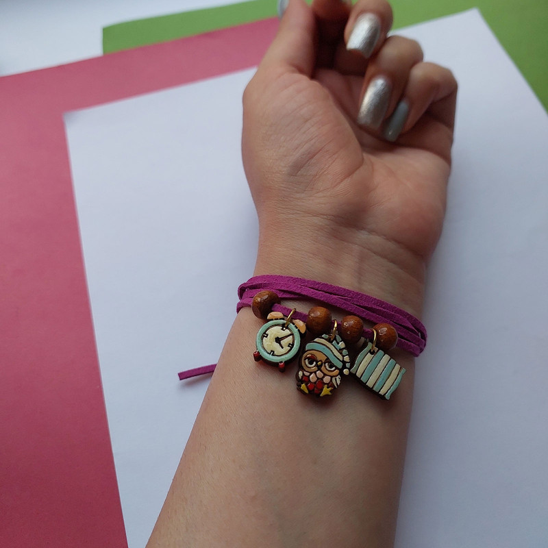 دستبند زنانه که دارای آویز های سه تایی و مهره های چوبی می باشد و زیبایی دو چندانی به دستبند بخشیده است. آویز دستبند طرح جغد، بالش و ساعت بوده و تداعی کنند یک جغد خوابالو می باشد. دستبند با گره زدن بند آن بسته می شود و بهترین گزینه برای دادن هدیه است. بند دستبند حالت بندی دارد ملاک رنگبندی نیز رنگ بند دستبند می باشد. در ضمن این محصول دومنظوره بوده و هم به عنوان دستبند و هم به عنوان پابند قابل استفاده خواهد بود.