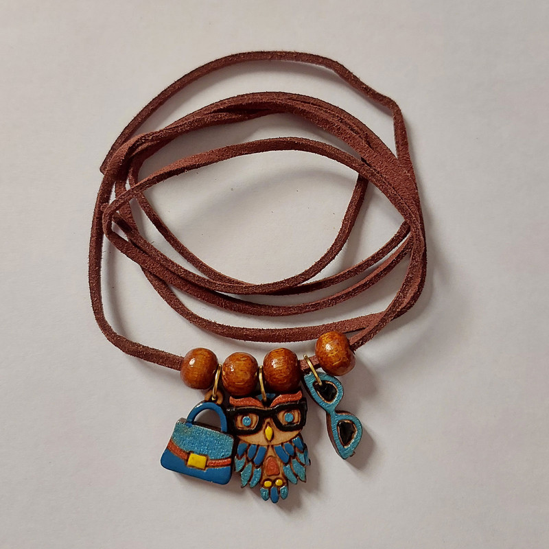 دستبند زنانه که دارای آویز های سه تایی و مهره های چوبی می باشد و زیبایی دو چندانی به دستبند بخشیده است. آویز دستبند طرح جغد، کیف و عینک بوده و دستبند با گره زدن بند آن بسته می شود و بهترین گزینه برای دادن هدیه است. بند دستبند حالت بندی دارد و ملاک رنگبندی نیز رنگ بند دستبند می باشد.
