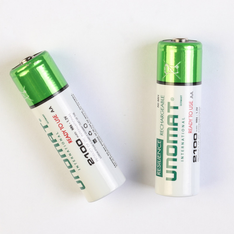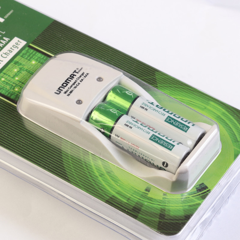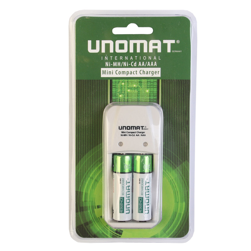 به همراه این شارژر 2 عدد باتری قلمی قابل شارژ یونومات با ظرفیت بالای 2100 میلی آمپر نیز وجود دارد.