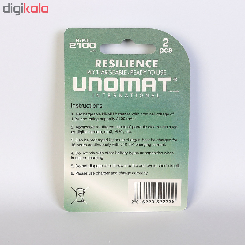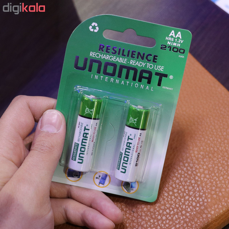باتری « NI-MH-HR6» محصولی از برند «یونومات» (UNOMAT) است. در این محصول، 2 عدد باتری قلمی قرار دارد که از نوع قابل شارژ هستند که آماده به استفاده و شارژ میباشند و میتوان آنها را پس از تخلیه به وسیلهی دستگاه شارژر مجددا شارژ کرد. خود شرکت سازنده، شارژرهای خاصی را برای این کار ارائه کرده و البته میتوان از شارژرهای موجود از سایر برندها هم برای این کار استفاده کرد. نوع فناوری به کار رفته در این باتریها «نیکل – متال هیدرید» (Ni – MH) است و ظرفیت نامی هر یک از آنها 2100 میلی آمپر ساعت اعلام شدهاست. باتریهای نیکل – متال هیدرید در مقایسه با باتری آلکالاین، قدرت سه برابر بیشتری دارند و در دستگاههای High Drain عملکرد بهتری از خود نشان میدهند. خود شرکت سازنده این باتریها را به صورت از پیش شارژ شده میفروشد و میتوانید بلافاصله پس از باز کردن در بستهبندی از باتریها استفاده کنید. باتری یونومات برای استفاده در دستگاههایی از قبیل دوربین عکاسی،دسته بازی ایکس باکس و چراغ قوه و مواردی از این قبیل که به قدرت زیادی نیاز دارند طراحی شدهاست. میتوانید برای اسباببازیهای کودک از قبیل ماشینهای کنترلی که مرتبا باتری مصرف میکنند، باتریهای قابل شارژ تهیه کنید و بتوانید پس از اتمام انرژی، دوباره آنها را شارژ کنید. به این ترتیب در هزینهها صرفهجویی خواهید کرد.
