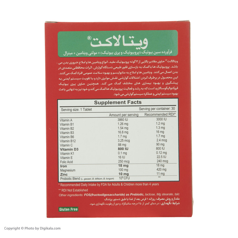 ویتالاکت یک ترکیب پروبیوتیک و پریبیوتیک (سین بیوتیک) برای همه اعضای خانواده است که حاوی مقادیر بالایی از 3 سویه باکتری سودمند (لاکتوباسیلها، بیفیدوباکترها)، انواع ویتامین ها و املاح ضروری بدن می باشد. پروبیوتیک ها با کمک به بازسازی فلور طبیعی دستگاه گوارش اثرات محافظتی متعددی در بدن اعمال می کنند. ویتامین ها و املاح نیز به متابولیسم و بهبود سلامت عمومی افراد کمک می کنند. این محصول در برطرف کردن اختلالات گوارشی نقش موثری داشته و با تقویت سیستم ایمنی به پیشگیری و بهبود بیماری های مختلف کمک می کند. همچنین حاوی پریبیوتیک فروکتوالیگوساکارید است که به رشد و فعالیت پروبیوتیک ها کمک میکند و خود نیز به تنهایی باعث بهبود سیستم ایمنی و عملکرد سیستم گوارشی میشود.