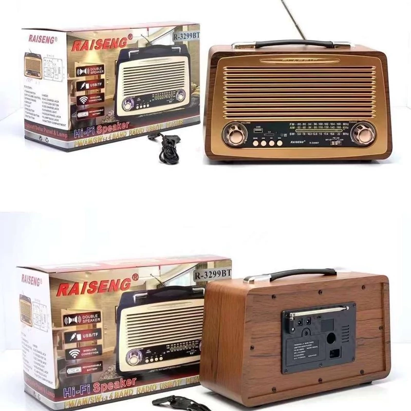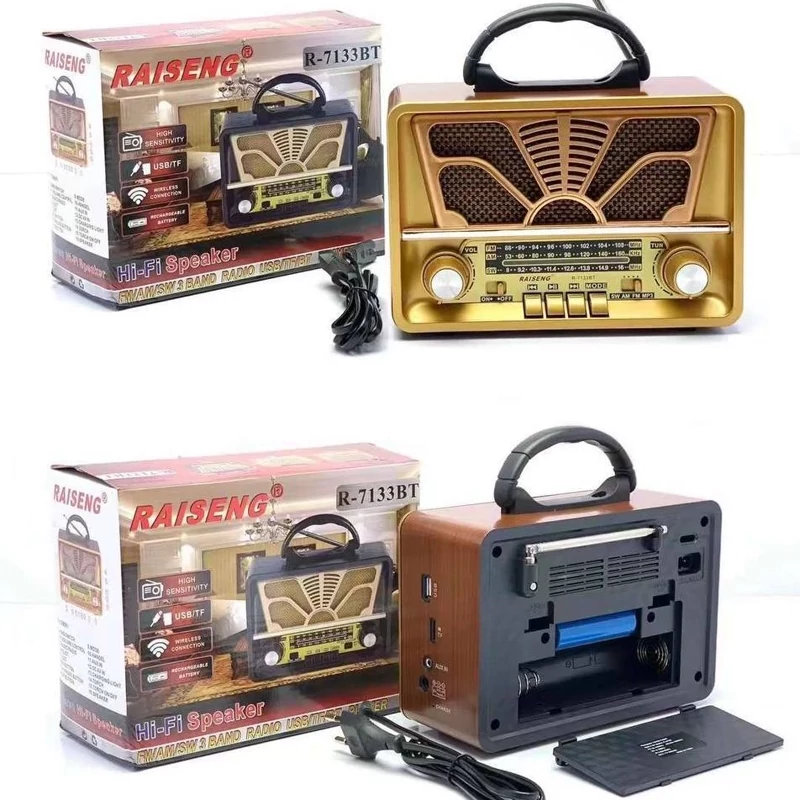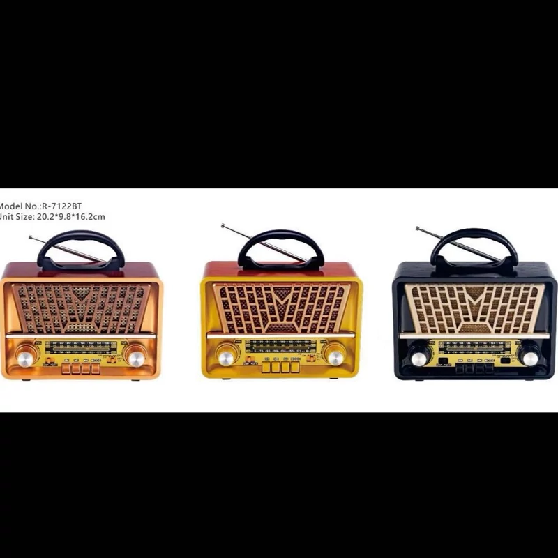 اسپیکر بلوتوث دار طرح رادیو مدل R7122.رادیو چهار موج قوی. فلاش خور و رم خور. طرح چوب وبسیار شیک و بادوام .هم شارژ و هم باطری های قلمی بزرگ و هم برق.