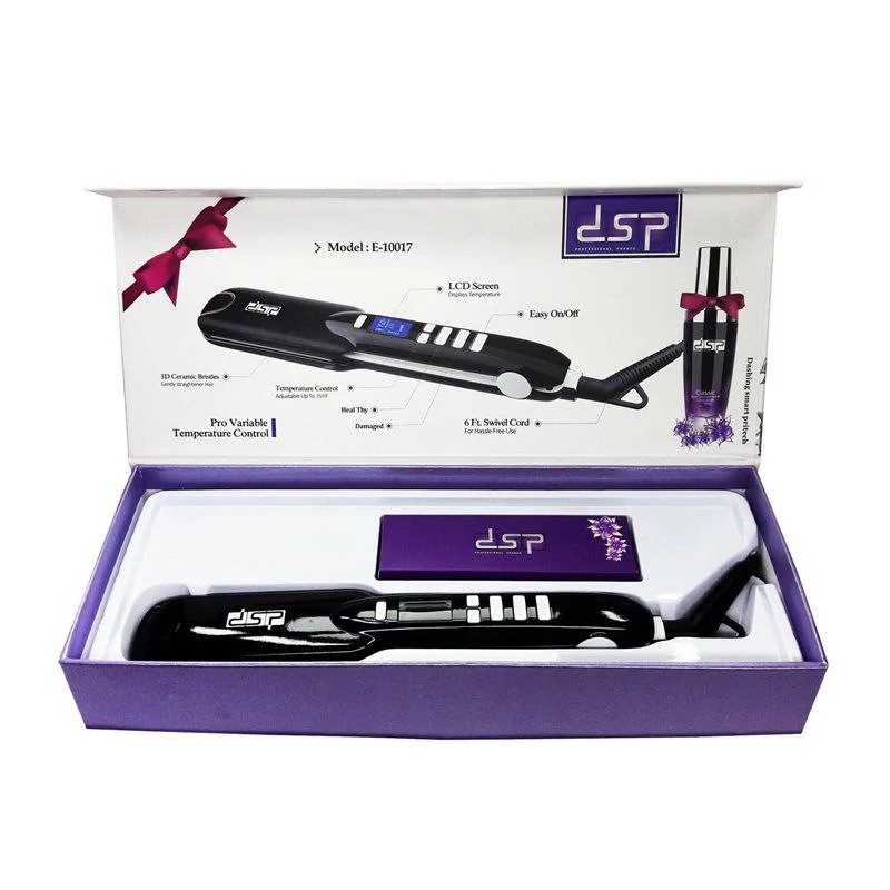 اتو مو کراتینه DSP مدل E-10017 جنس صفحه تیتانیوم و مخصوص کراتینه و پروتئینه کردن مو ها توزیع یکنواخت حرارت در صفحات اتو