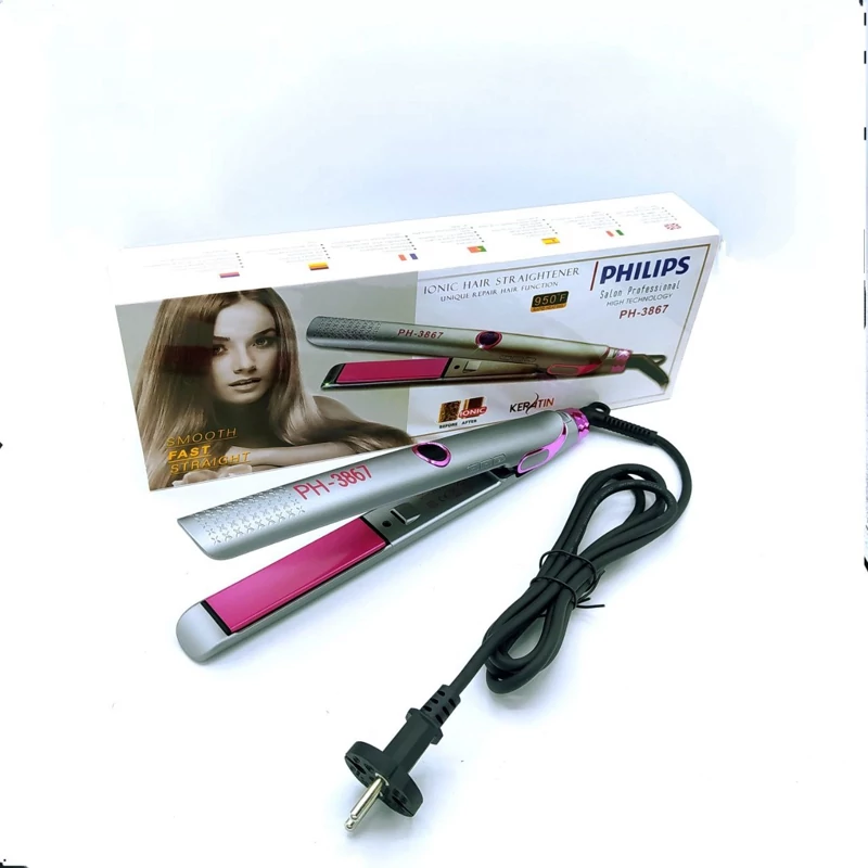 ✳️🔰✳️اتو مو فیلیپس از فناوری تولید یون سود می برد. یونها بار الکتریکی مو ها را خنثی می کنند و با تضعیف پیوند بین مولکول های آب تبخیر آن ها با حرارت پایین را ممکن می سازند.اتومو فیلیپس مدل3867قابلیت تنظیم دمای چند گانه دارد. اگر موهایتان ضخیم و زبر هستش برای حالت دهی بهتر باید از دما 600 درجه به بالا استفاده کنید . اما اگر مو های نازکی دارید دمای بالا به آن ها اسیب می رساند پس بهتر هست که از دمای پایین برای حالت دادن آن ها استفاده کنید.