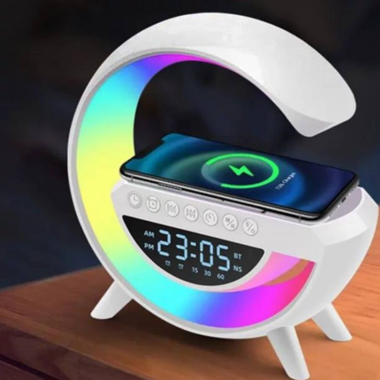 اسپیکر بلوتوث دار و وایرلس دار دارای شارژر دهی بدون سیم موبایل و ساعت دارای ساعت LED