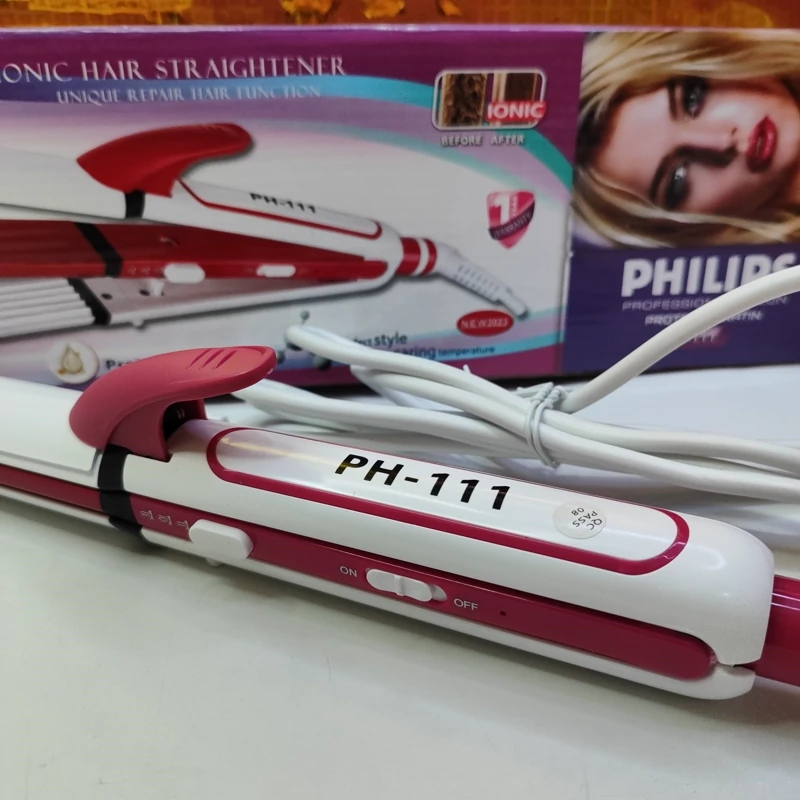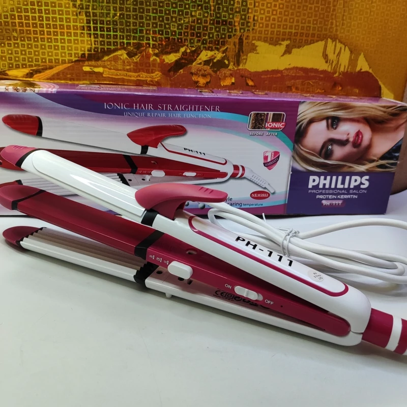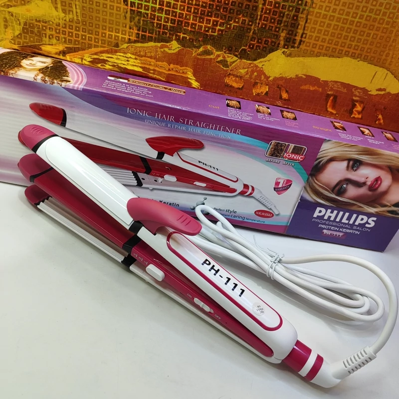 اتو مو سه کاره فیلیپس مدل PH111 دارای طراحی خاص و منحصر بفردی می باشد .این اتو مو در ترکیب رنگ قرمز و سفید طراحی و به بازار عرضه شده است. این اتو مو در واقع یک دستگاه با 3 کارکرد متفاوت می باشد. بدین ترتیب که سه صفحه متفاوت دارد که عبارتند از :اتو مو ویو مو و فر کننده مو. در واقع با خرید آن شما 3 دستگاه متفاوت را خریداری کرده اید. از دیگر قابلیت های این دستگاه قفل صفحات آن است و از هر کدام که استفاده کنید. می توانید آن را باز و مابقی را قفل نمایید. صفحات اتو مو متوسط و از جنس سرامیک هستند و کار اتوکشی با آن بسیار آسان می باشد.