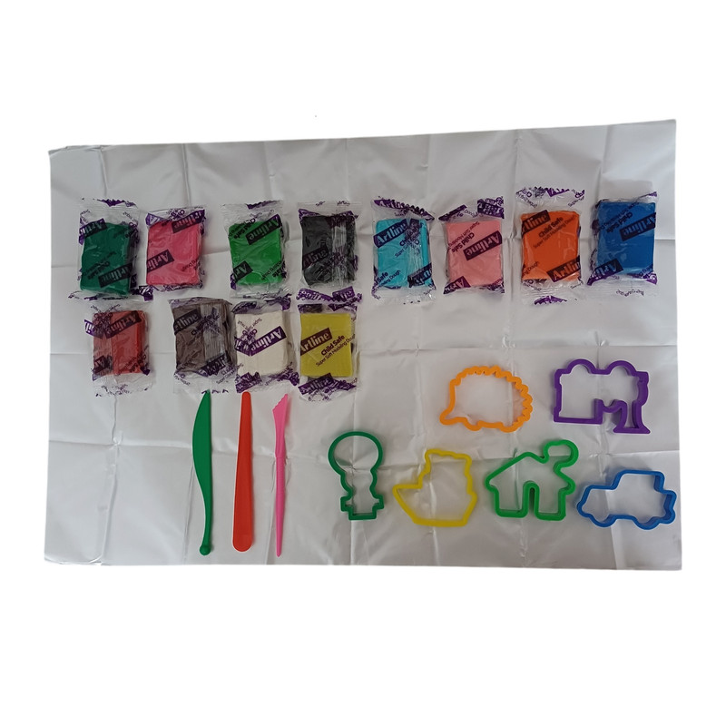 12 عدد خمیربازی -3 عدد ابزار برش- 6 عدد قالب- 1 عدد سفره
