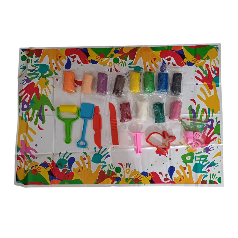 ۱۲ رنگ خمیر ۲۲ گرمی، سفره، 2 عدد ابزار، سرنگ کوچک، ست قالب سرنگ، ۲ عدد قالب برشی 1 عدد قالب حیوان