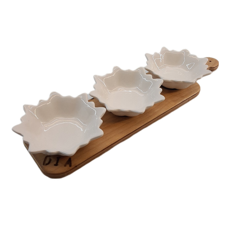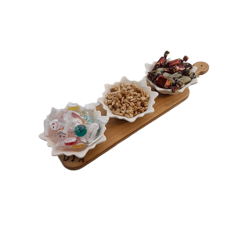 این ست تشکیل شده 3 عدد کاسه از جنس سرامیک با ارتفاع 5 سانتیمتر و قطر 10 سانتیمتر و سینی کف چوبی به ضخامت 12 میل ضد آب که بسیار جلوه عالی را به محصول بخشیده در ضمن این محصول کاملا ضد آب می باشد