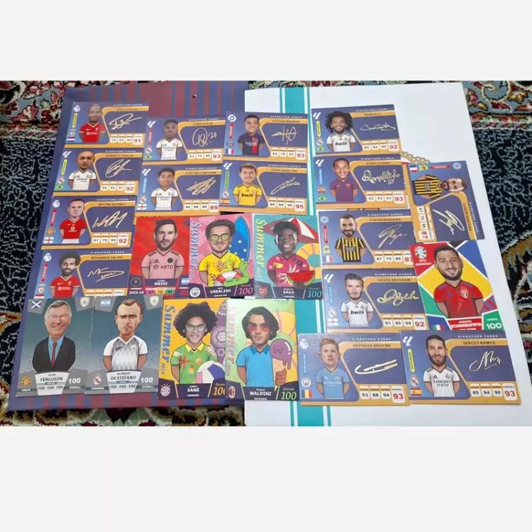 یک کارت بیسیک مسی_ کارت سامر جک گریلیش و ساکا و پالومالدینی و سانه_ کارت100 فرگوسن و دیستفانو_ کارت یورو دوناروما_ کارت امضای بنزما 2عدد و کارت امضای رونالدینیو و کاسیاس و محمد صلاح و مارسلو و امباپه و رونی و روبرتو کارلوس و فنداک و وینیسیوس و دی بروینه و راموس و بیلینگام و دیوید بکام