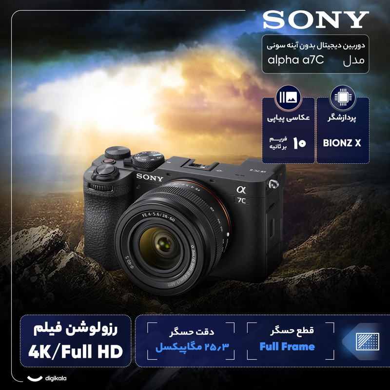 دوربین دیجیتال بدون آینه سونی مدل Alpha a7C Kit 28-60mm یک گزینه حرفهای و جمعوجور برای عکاسان جدی است که به دنبال کیفیت تصویر فولفریم در بدنهای سبک و قابل حمل هستند. این دوربین بدون آینه با لنز قابل تعویض، بدنهای ترکیبی از پلاستیک و فلز (آلیاژ منیزیم) دارد و با ابعاد ۱۲۴x۷۱x۶۰ میلیمتر و وزن ۴۲۴ گرم، یکی از کوچکترین دوربینهای فولفریم به شمار میرود. با قرار گرفتن باتری و کارت حافظه وزن دستگاه به ۵۰۹ گرم میرسد و لنز همراه آن با مانت Sony-E امکان استفاده از طیف گستردهای از لنزهای سازگار را فراهم میکند.